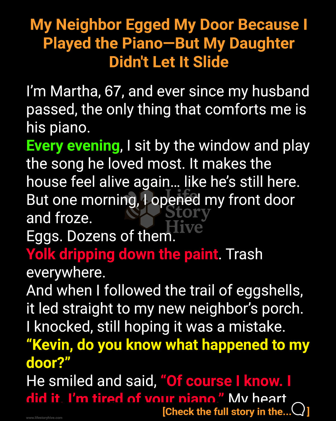 When Martha woke to find her front door smeared with eggs and trash, she knew exactly who’d done it. Her cruel neighbor had finally snapped over her daily piano playing. But when her daughter found out, she set off a chain reaction that would unite everyone and teach one man an unforgettable lesson.