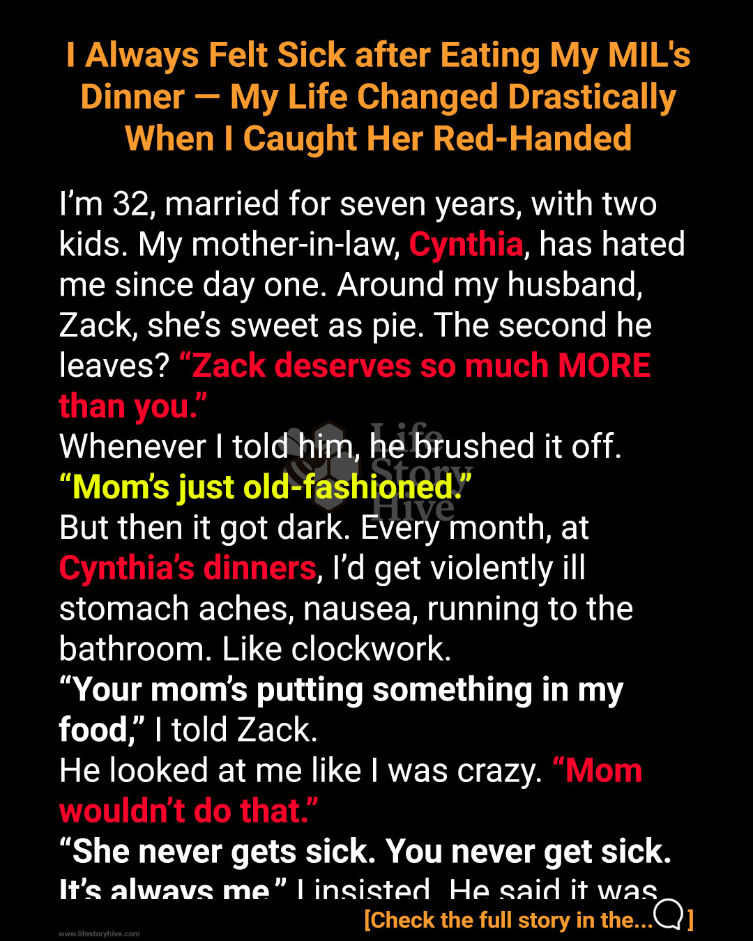 Cynthia never approved of me from day one. She never outright said it, but her actions spoke volumes. She had this uncanny ability to be the sweetest person in Zack’s presence, but the moment he turned his back, she’d unleash her disdain.