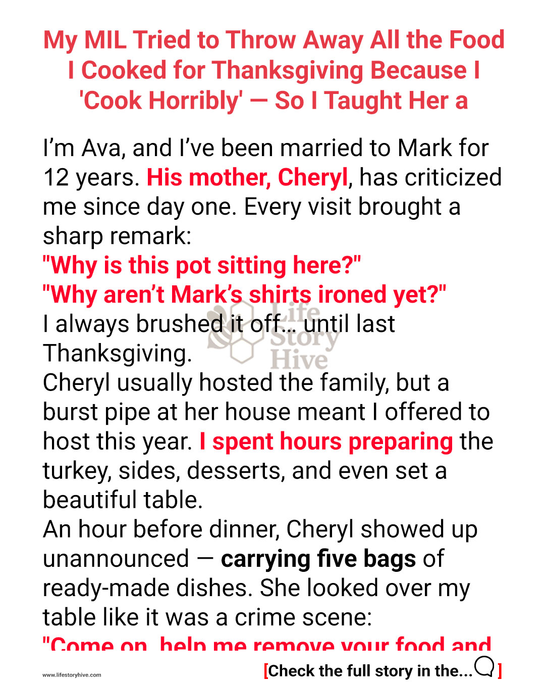For 12 years, my mother-in-law criticized everything I did. But when she walked into my house on Thanksgiving with bags of her own food and told me to throw mine in the trash, I decided it was time she learned exactly what kind of cook I really was.