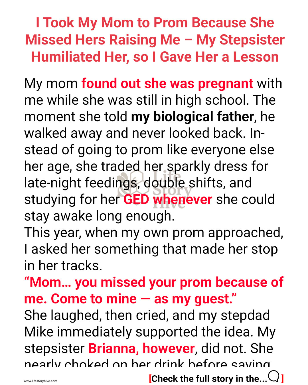 Mom faced everything alone after that. College applications went in the trash. Her prom dress stayed in the store. Graduation parties happened without her. She juggled crying kids she babysat for neighbors, worked graveyard shifts at a truck stop diner, and cracked open GED textbooks after I’d finally dozed off.